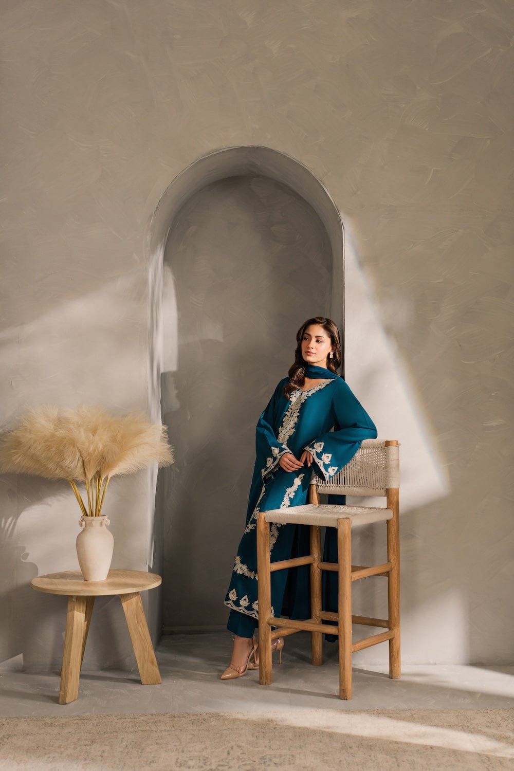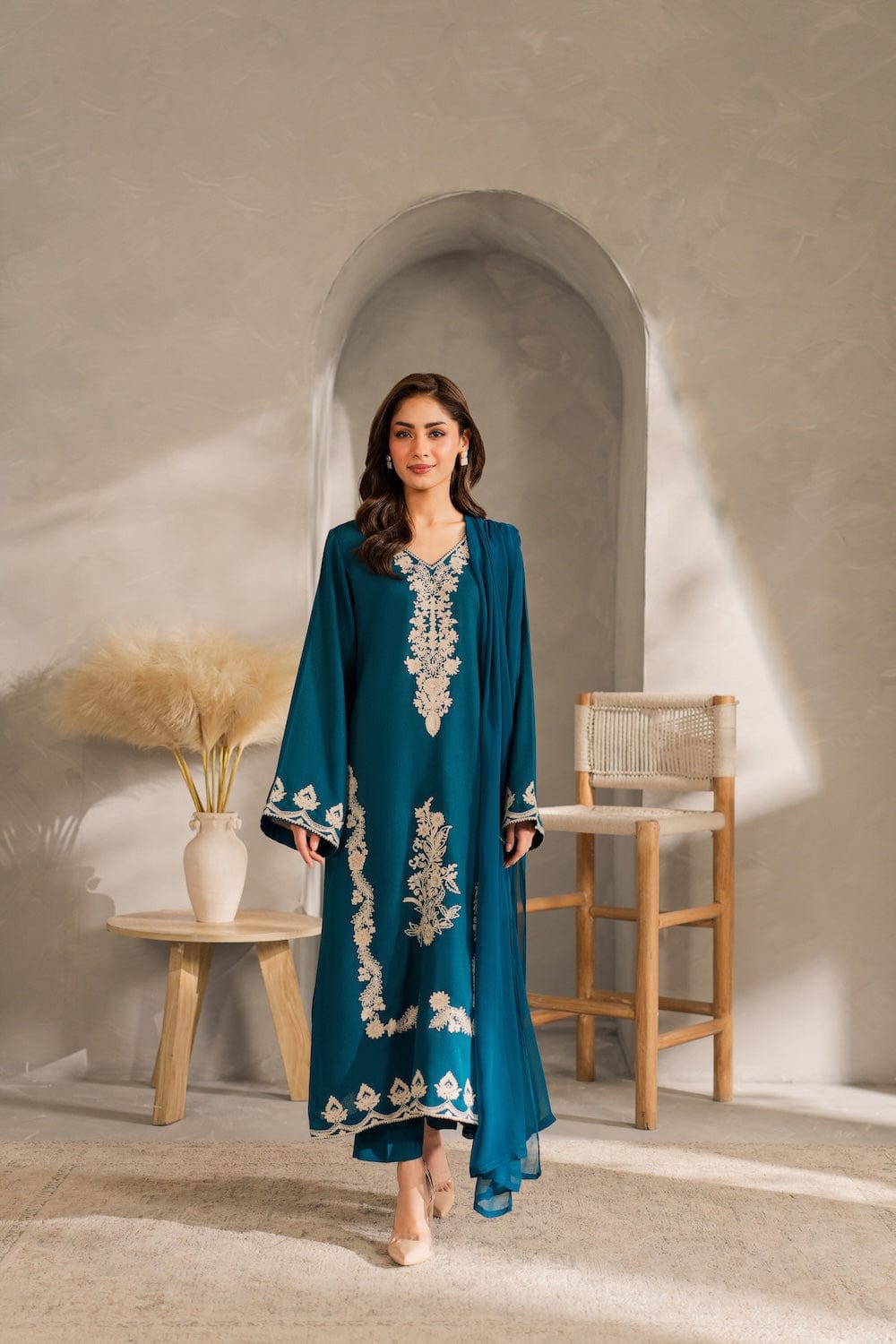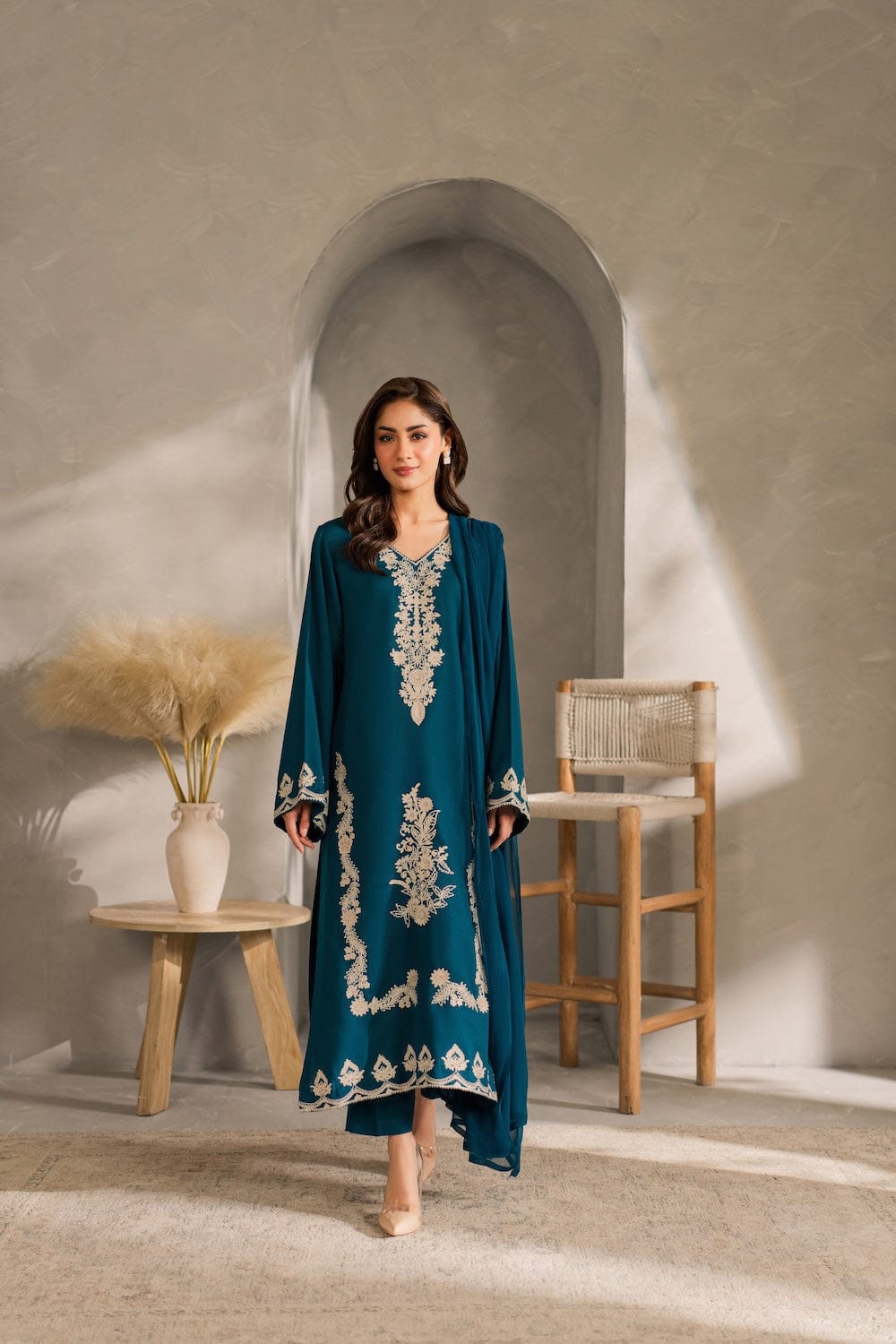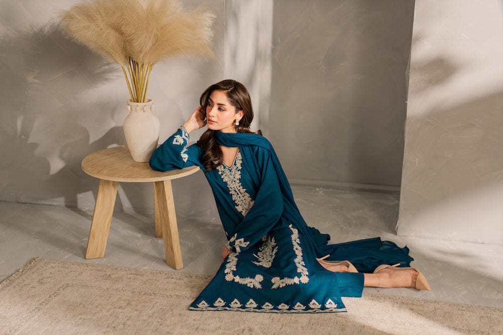 ✔ Design: A 3-piece set (Dupta + kurta + trousers/shalwar) with a tailored fit and contemporary silhouette.