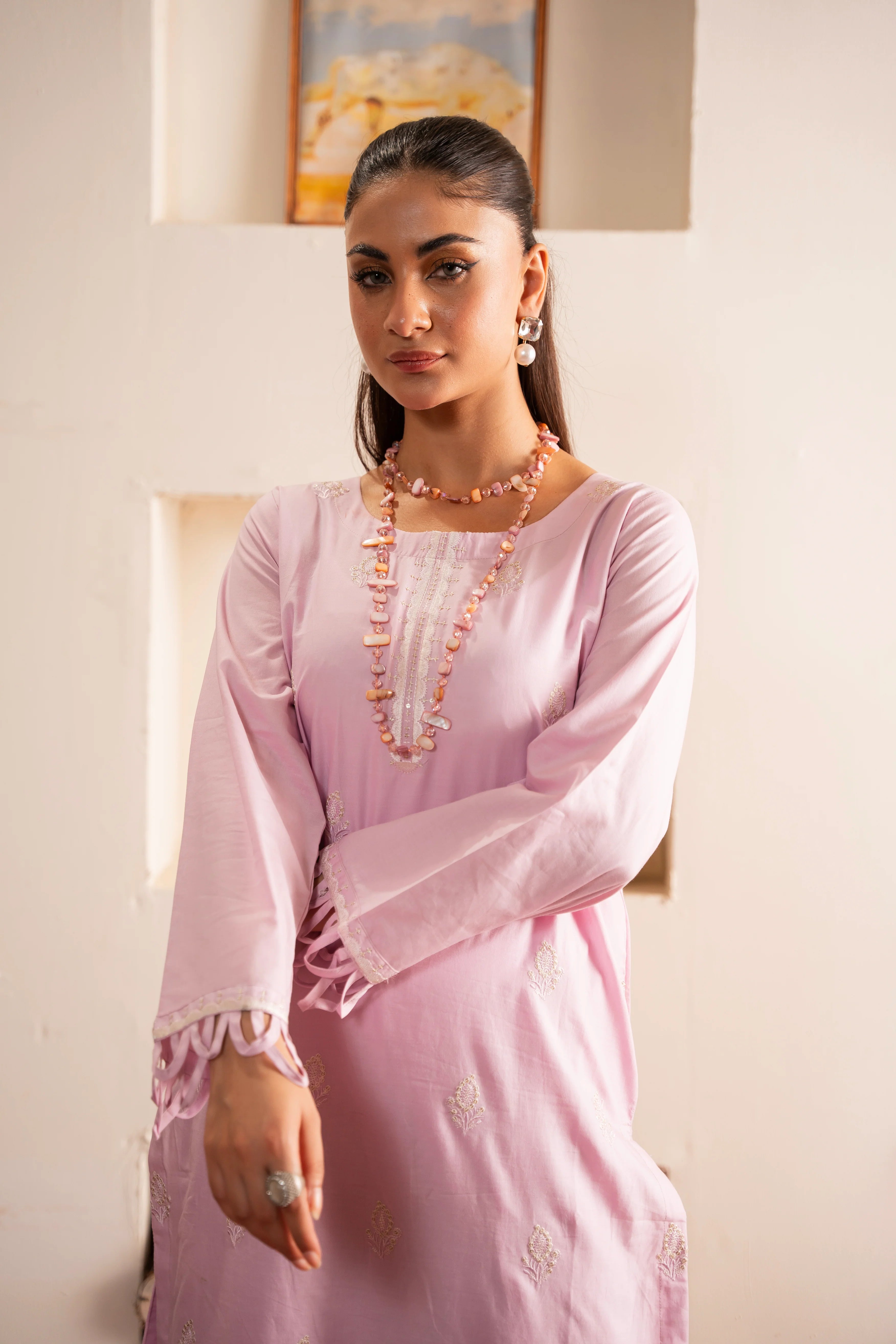 • It is adorned with embellishments along the front, with a beautifully detailed neckline and sleeve openings.